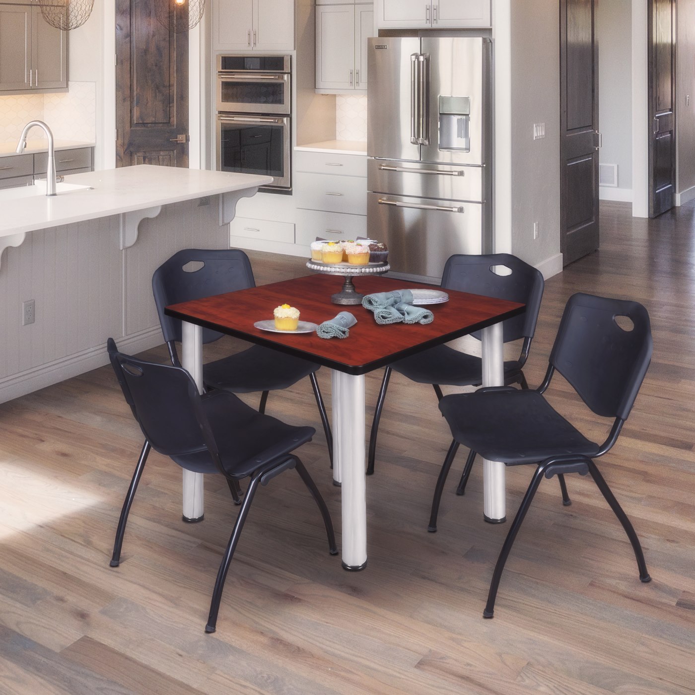 48 in Square Breakroom Table- Cherry Top, Chrome Legs, 4 M Stack Chairs- Black