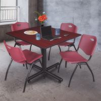 The elegant collection puts the class in classroom. These versatile tables are at home in stylish restaurant settings as well as classrooms, breakrooms and more. This set includes one 48-inch square table and four Burgundy "M" Stack Chairs. The table is constructed of a thermal fused melamine laminate tabletop that is 1-inch thick and finished with a black T-Mold edge band. This Mahogany tabletop is double-sided and finished in Mocha Walnut on the other side. Rounded corners make the table safer for everyone. Simply pick the side you like and install the base on the other. Self tapping wood screws and a placement template are included. Laminates are scratch, stain and scald resistant and wipe clean easily. The base is constructed of a black tubular steel X-Base and is protected with a black powder coated finish for a uniform, matte finish. Adjustable glides on the bottom that raise the whole base off the ground give the collection an open, modern look. The sturdy, lightweight "M" stack chair by offers durability, style and value. Its black metal frame and contoured plastic seat and back are strong and easy to clean. This versatile stack chair easily stores away in stacks of 12 and features a built in handle for easy mobility. All chairs are backed by a 5-year limited manufacturer's warranty on chair bases and frames and a 2-year limited manufacturer's warranty on chair mechanisms and upholstery. table bases are backed by a 10-Year Limited Manufacturer's Warranty.Features for your benefit: