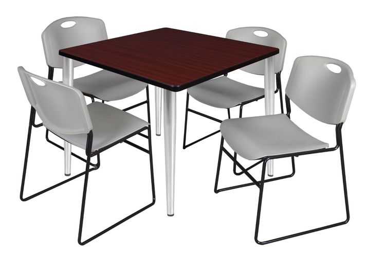 tables are a mid-century modern take on the standard post leg table and have an attractive tapered leg. legs come four to a set and assembly is a snap with just a few screws. This versatile table and chair set includes one 42-inch square table with chrome tapered legs and four Grey Stack Chairs. The table is constructed of a thermal fused melamine laminate tabletop that is 1-inch thick and finished with a black T-Mold edge band. This Mahogany tabletop is double-sided and finished in Mocha Walnut on the other side. Simply pick the side you like and install the base on the other. Self tapping wood screws and a placement template are included. Laminates are scratch, stain and scald resistant and wipe clean easily. A sleek and modern alternative to chunky post legs or pedestal style tables, legs are constructed of a durable steel and finished in a modern chrome to match any decor. Leveling glides on the bottom of each leg ensure a level and steady table. 's Patent-Pending stack chair is not only unique, but durable, sturdy and versatile as well. The seat and back are treated with an anti-microbial agent, which makes it perfect for schools, waiting rooms, cafeterias and more. A reinforced black metal frame is designed to support up to 400lbs and a built in handle makes moving the chair easier. All chairs are backed by a 5-year limited manufacturer's warranty on chair bases and frames and a 2-year limited manufacturer's warranty on chair mechanisms and upholstery. tables are backed by a 10-year limited manufacturer's warranty.Features for your benefit: