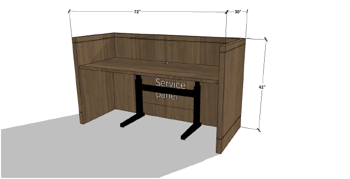 - Cable management: 1 grommet on the worksurface, cable chase below for wiring for mechanism, accessed through service panel and open to the floor.