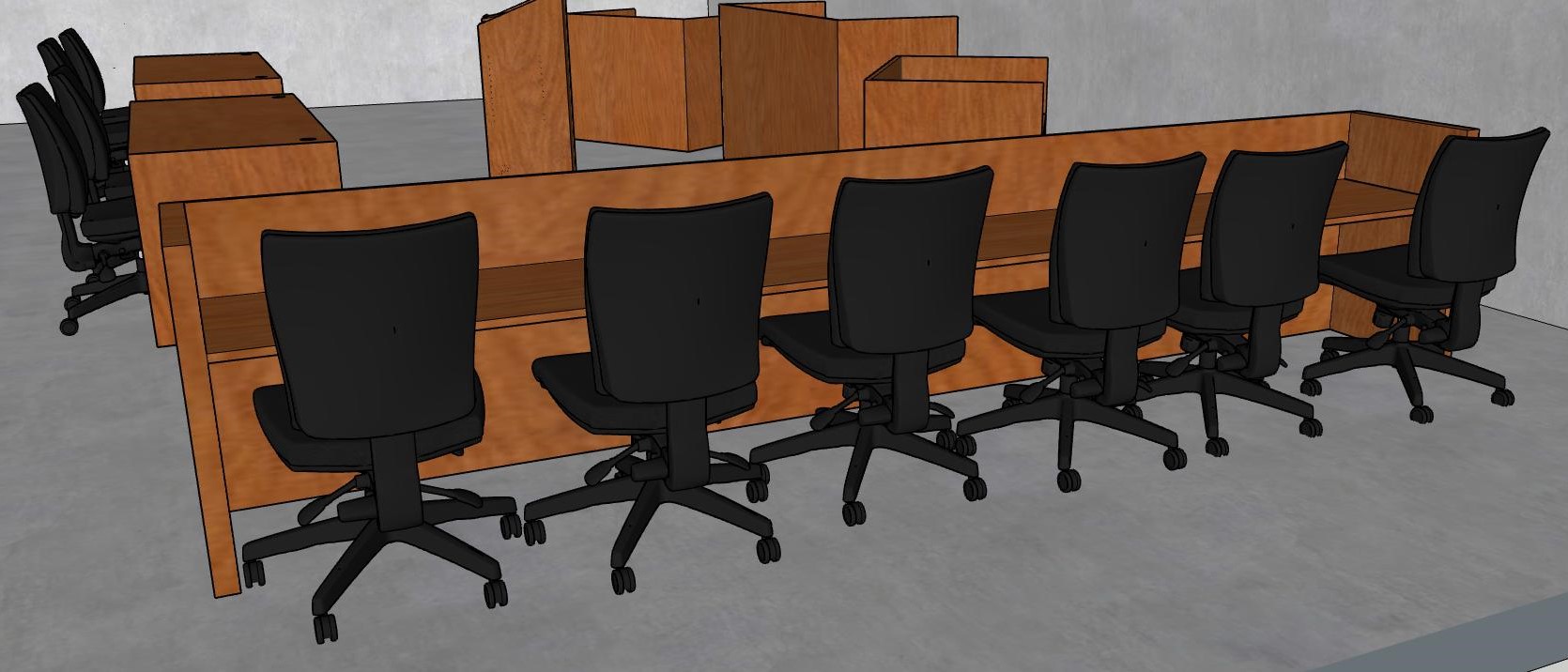 Finally, a jury box that does not cost a fortune! Available in mahogany, ash grey, or cherry laminates. Different sizes are available with widths from 9 to 18 feet to meet your specific requirements.- Dimensions: A 4-person jury box dimensions 112"w x 24"d x 36"h. A 6-person jury box dimensions: 168"w x 24"d x 36"h. Other widths are available.