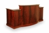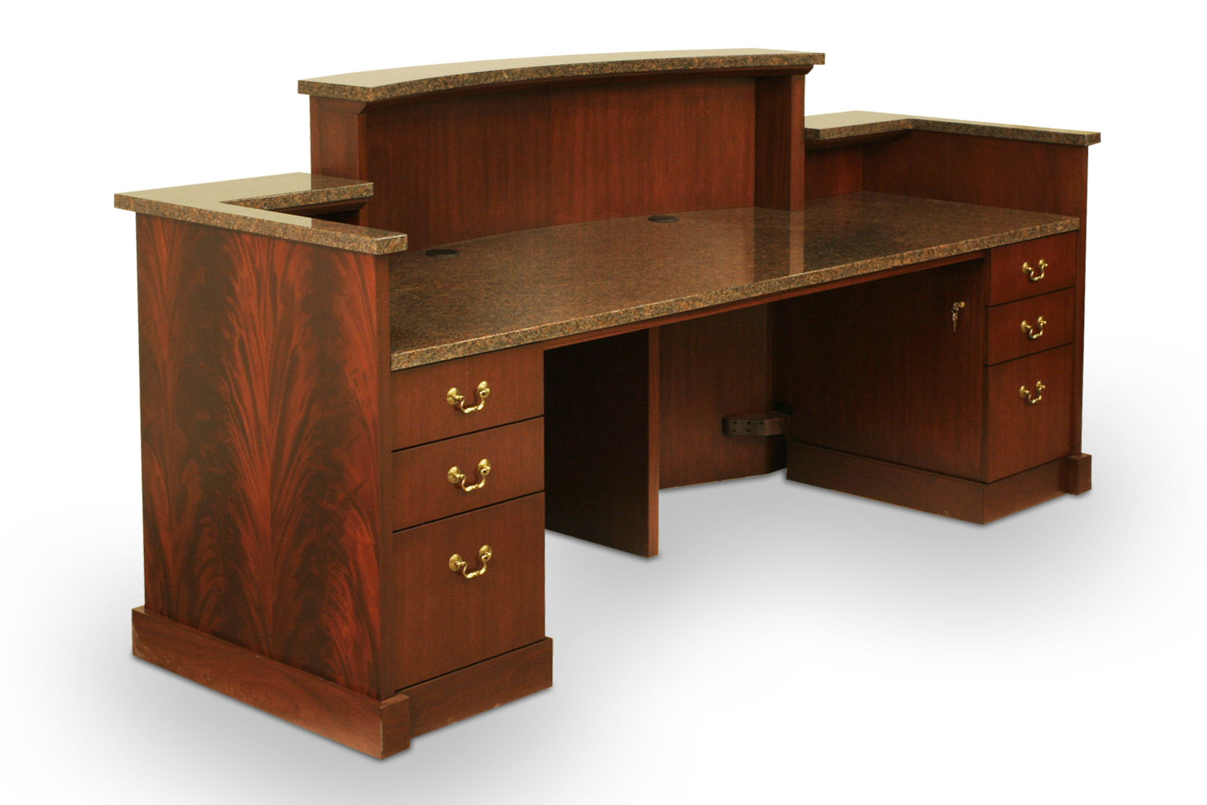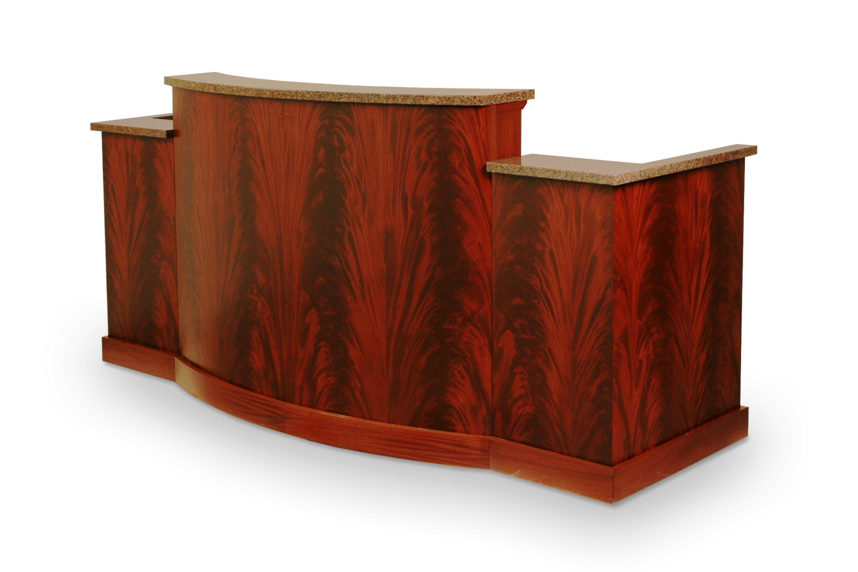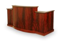 Beautiful handcrafted in crotch mahogany. Wood, granite, or laminate countertop with solid wood edge detail, wood chassis with a wood reveal, wood or laminate worksurface with one grommet. Can meet ADA requirements with the transaction top at approximately 34" high X 6" to 12" deep. Can also be used as an ADA Compliant Reception Desk.- Solid woods and veneers used on exterior surfaces are A1 select grades. Plain sliced American Walnut, White Oak, Maple, and Cherry, applied in a “reverse slip match” fashion resulting in a balanced appearance, as well as slip match Sapele (Mahogany), are the standard veneers used. Ash Burl, Birdseye Maple, and Crotch mahogany veneers are standard or any option on selected products only. Anigre veneers are available at an up-charge. Every effort is made to match solid wood and veneer of like color and grain, however, since wood is a natural material, some variation in grain, color, and character may occur. This variation is not considered a defect.