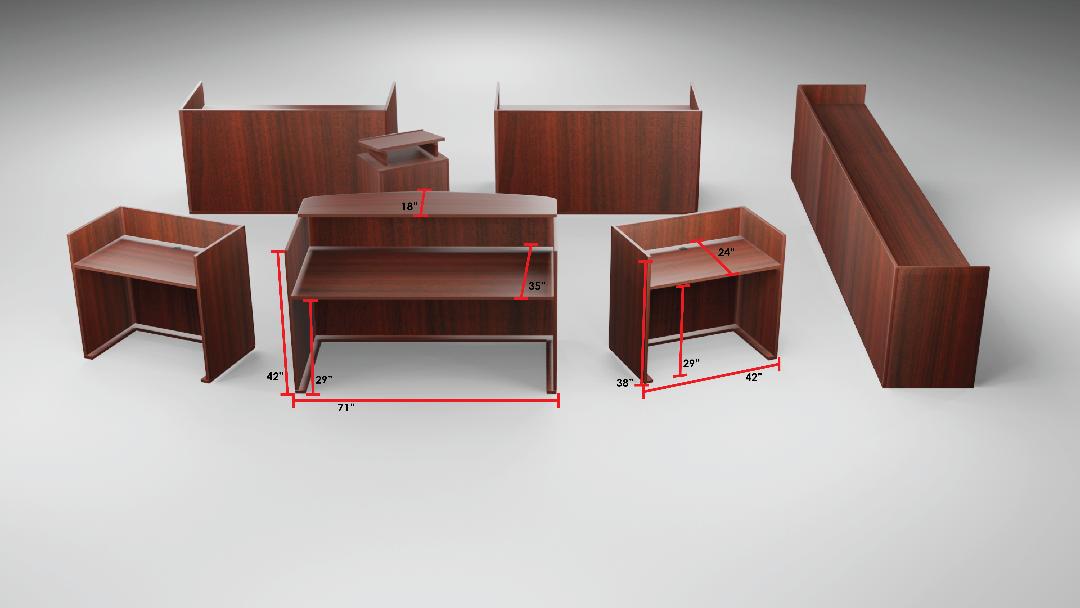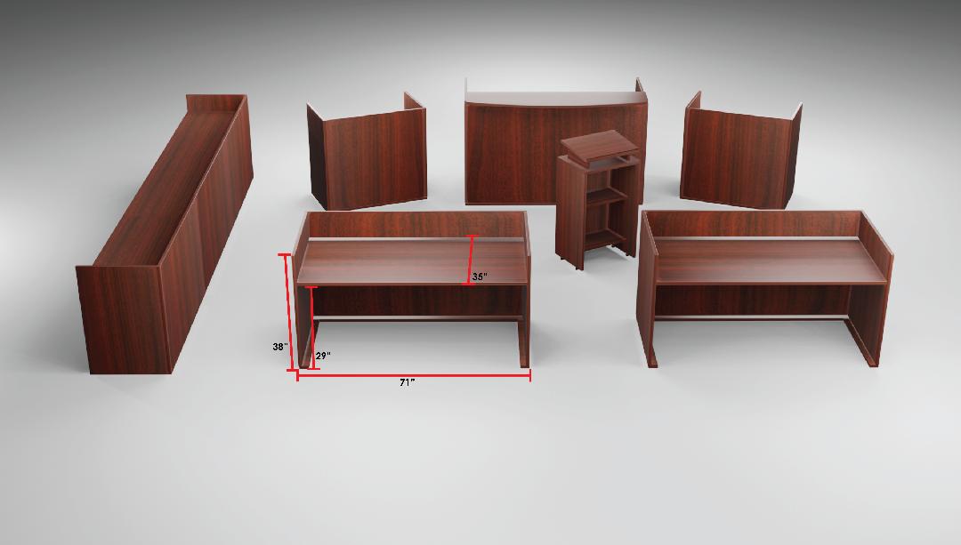 - (Item 1.) One each Judge's bench 71w x 35"d x 42"h. Includes #DPEL2 Power/Data Port which makes desktop power connectivity easy for laptops, cell phones, iPads, etc. With (2) USB 2.0 ports, (2) USB charging ports, (2) AC 125V 60Hz outlets, (1) front/rear ethernet port, (1) front/rear phone port. Angled toward the user for convenience and ease in connecting. See the image below.
